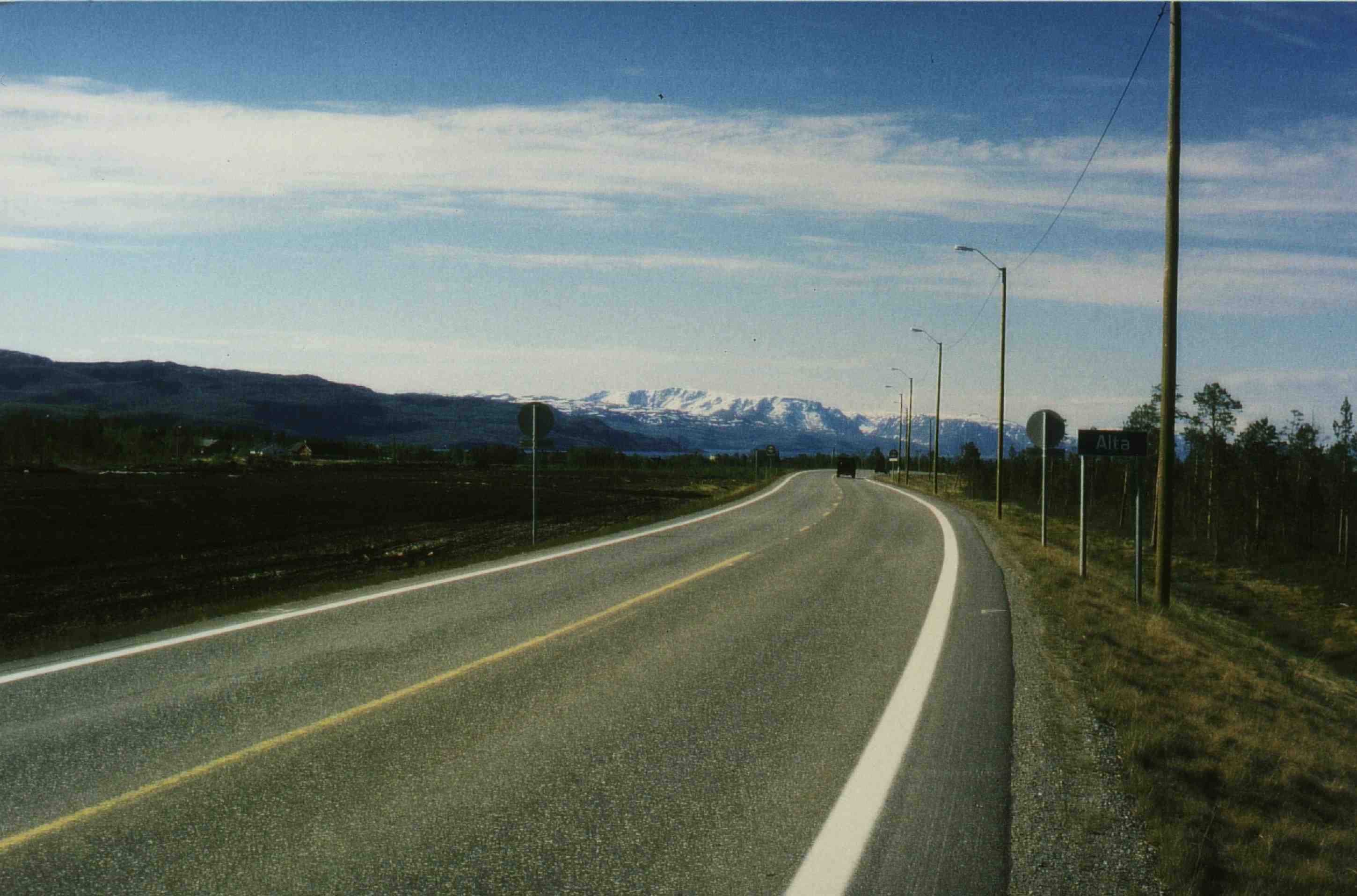Der Ruhetag hat sehr gut getan. Bei herrlichem Wetter startete ich in Richtung Enontekiö. Der Zöllner an der Grenze kümmerte sich gar nicht weiter um mich. Nach etwa 30 Km hörte ich plötzlich ein fürchterliches Knacken in der Schaltung. Was war geschehen? Die neue Kette war gerissen. Ich ahnte fürchterliches. Allein auf weiter Flur, und nun dieses. Ich untersuchte zunächst erst einmal die Sachlage. Hierbei stellte ich fest, daß der Stift mit dem ich die neue Kette vernietet hatte, herausgefallen war. Hätte ich vorher die Montageanleitung sorgfältiger gelesen, so wäre mir sicherlich aufgefallen das ich den Stift genau verkehrt herum eingesetzt habe. Für mich bedeutete es, das gesamte Gepäck entladen, eine Packtasche gänzlich auspacken, weil das Paket mit den Ersatzteilen natürlich ganz unten lag. Ähnlich wie in der Kühltruhe, egal was man braucht, es liegt meistens ganz unten. Ich setzte also den Stift dieses mal richtig ein und es konnte, nachdem ich alles wieder verstaut hatte, weitergehen. Dieses fand alles auf dem schmalen Parkstreifen, unmittelbar neben der Fahrbahn statt. Links und rechts neben den Straßen befinden sich in Skandinavien nämlich tiefe Gräben, um im Winter den Schnee rein schieben zu können. Nach einer Zwangspause von etwa 40 Min war der Schaden ohne Folgeschäden behoben und ich fuhr bei strahlendem Sonnenschein weiter. In Enontekiö steuerte ich die erste Bank an um die Geldfrage zu klären. Mir fiel ein Stein vom Herzen, wie mir die Bankangestellte sagte, das es keine Schwierigkeiten mit meiner Scheckkarte gäbe. Meinem weiteren Reiseverlauf stand also nichts mehr im Wege. Schnell probierte ich meine Scheckkarte aus und zog 300 Fm, was später noch sehr wichtig werden sollte. Ich komme noch darauf zurück. Nach einem kleinen Imbiß ging es weiter Richtung Norwegische Grenze. Ursprünglich hatte ich kurz vor der Grenze eine Übernachtung auf dem Campingplatz in Palojärvi geplant, doch das Gelände war so eben und der Rückenwind so günstig, daß ich weiterfuhr und trotz der Panne nach 170 Km den Campingplatz in Kautokeino erreichte. Nun hatte ich wieder ein Geldproblem. Ich war ja mittlerweile in Norwegen, was für den heutigen Tag noch gar nicht eingeplant war. Ich fuhr also erst einmal in den Ort um auch hier den Geldautomaten auszuprobieren. Auch in Norwegen bekam ich anstandslos mein Geld. Ich fuhr zurück was wieder 10 Km (hin und zurück) mehr bedeutete, um mich jetzt gänzlich beruhigt wegen dieser vertrackten Geldgeschichte auf die Nacht vorzubereiten. Nach dieser Tagesleistung von insgesamt 181 Km hatte ich mit dem Einschlafen keine Probleme.