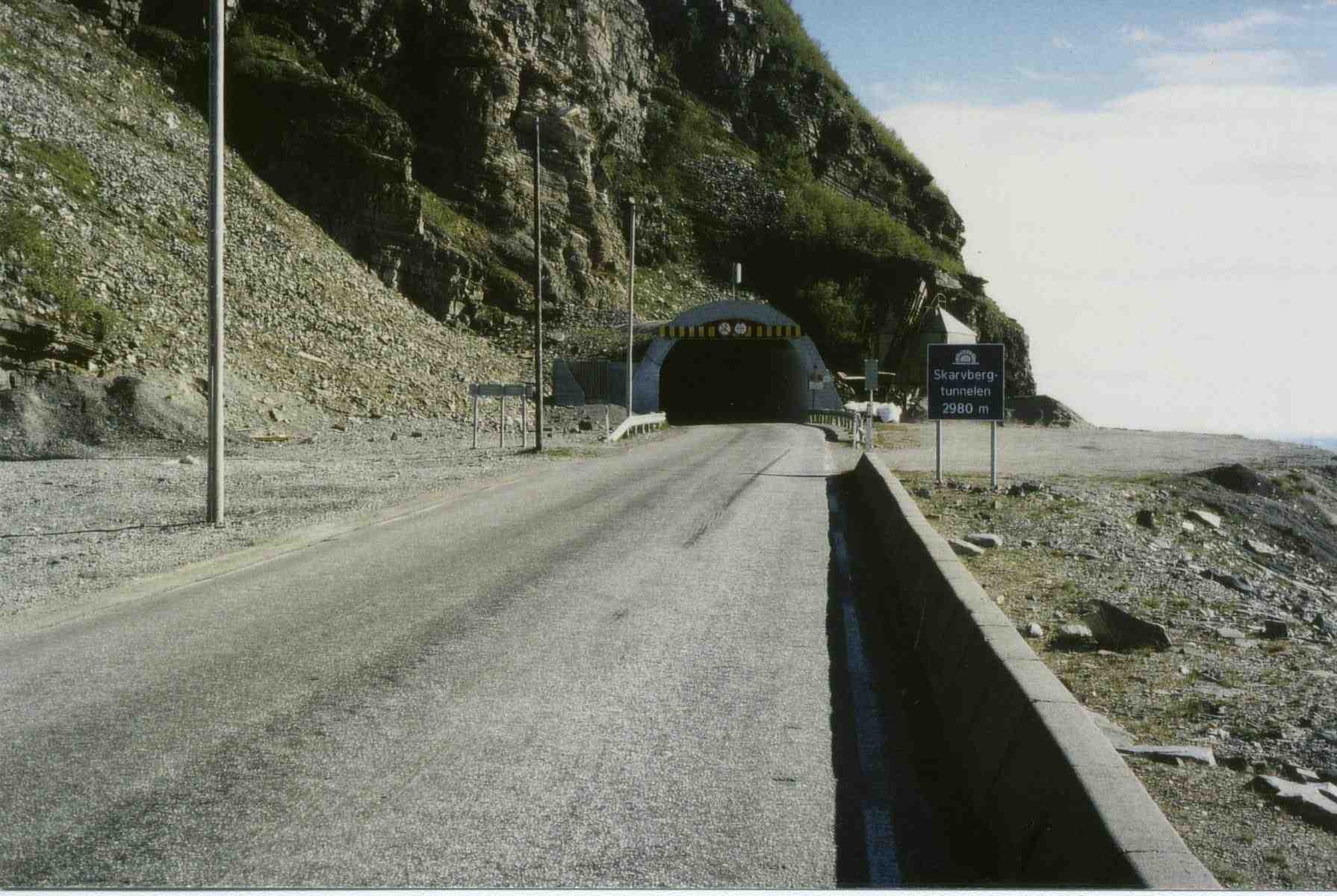 Auf zur letzten Nordkap Etappe. Nach einem kargen Frühstück (Knäckebrot mit Käse) und mit etwas schweren Beinen wollte ich heute die Insel Mageroya auf der das Nordkap liegt erreichen. Der Weg führte direkt am Porsangen entlang. Vorbei an den Fischerbooten und den langen Holzgerüsten auf denen die bekannten Stockfische getrocknet und zum Verkauf angeboten werden. Der Wind wehte schwach und die Sonne schien strahlend vom Himmel. Nach 25 Km kam der Skarvberg Tunnel in Sicht.