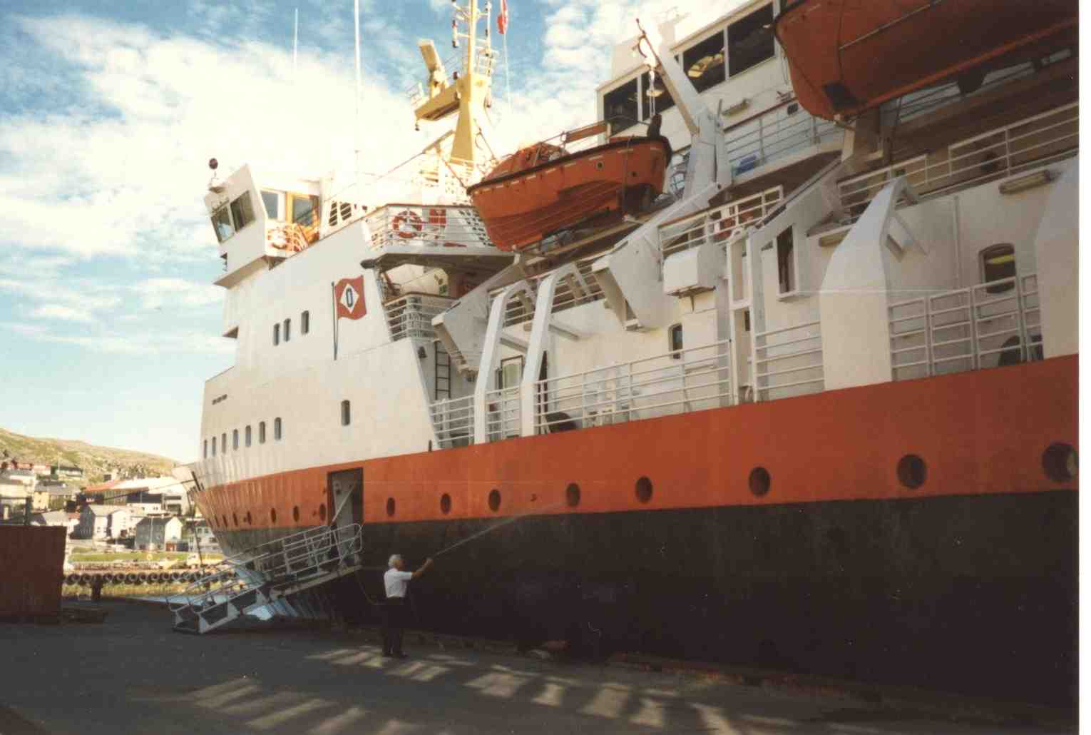 Ich hatte nur eine einfache Karte gekauft, und mußte mir deshalb eine freie Couch in der Cafeteria suchen um die letzten paar Stunden zu schlafen. Wie ich feststellte, war ich nicht der einzige mit einer billigen Karte. Viele gepolsterten Bänke waren schon belegt. Um 7.00 wurden wir durch ein Putzgeschwader geweckt, das die Billiggäste ohne Rücksicht mit Staubsaugern vertreibt. Also stehe ich auf und kaufe mir in der durchgehend geöffneten Cafeteria ein großes Sandwich zum Frühstück. Die restliche Zeit bis Kirkenes verbringe ich auf dem Oberdeck und bewundere die zauberhafte Eismeerküste mit den verstreut liegenden kleinen Ortschaften.